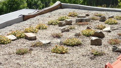 The building has a green roof that adds to the insulation and helps regulate inside temperatures in summer and winter.